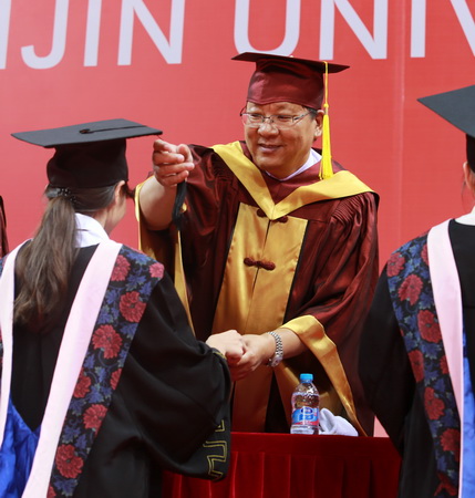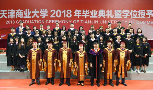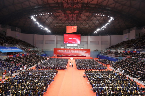 副校长、校学位评定委员会副主席齐恩平宣读毕业生毕业及授予学位的决定。曾担任大学生村官的马克思主义学院研究生李志青,保送北京大学硕士研究生的外国语学院本科生张甜甜,曾在中国人民解放军北海舰队服役两年、考取天津大学硕士研究生的信息工程学院本科生张世崇,留校从事少数民族辅导员工作的生物技术与食品科学学院本科生努尔比耶姆·麦麦提代表2018届毕业生发言,感谢学校的悉心培养,感恩老师的辛勤付出,畅谈了对实现未来美好生活的信心和决心。