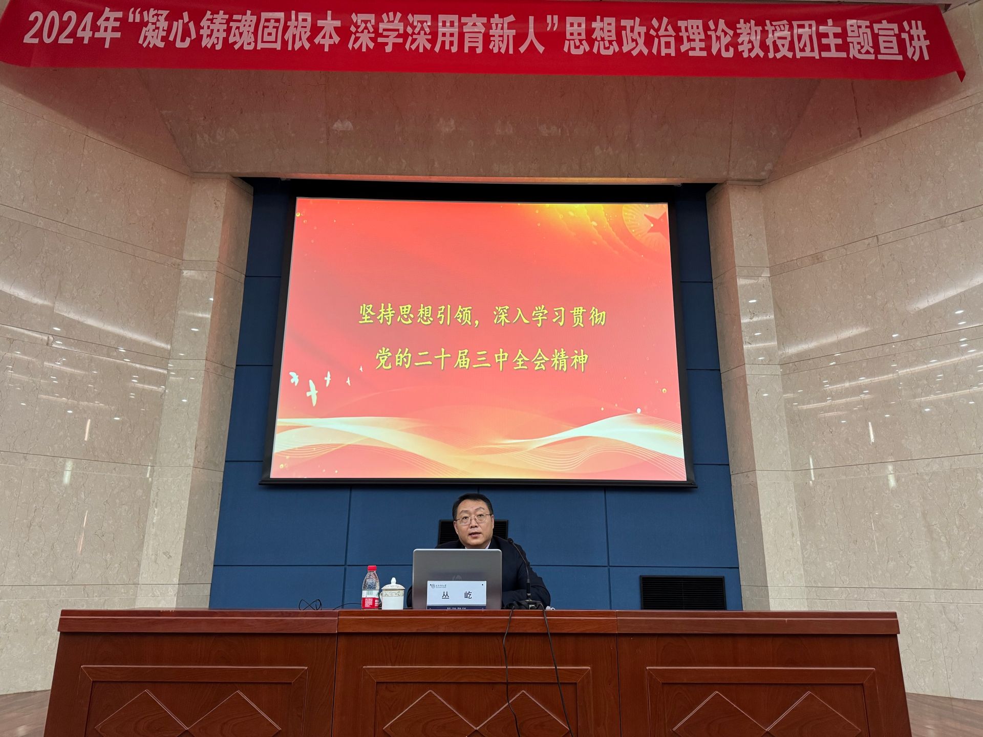 丛屹以“坚持思想引领,深入学习贯彻党的二十届三中全会精神”为主题,深入剖析了“五位一体”总体布局与“四个全面”战略布局的宏伟蓝图,强调了以人民为中心的发展思想,深刻解读了供给侧结构性改革,结合天津近年来产业发展的实际案例,生动诠释了“创新、协调、绿色、开放、共享”这一新发展理念的深刻意义。