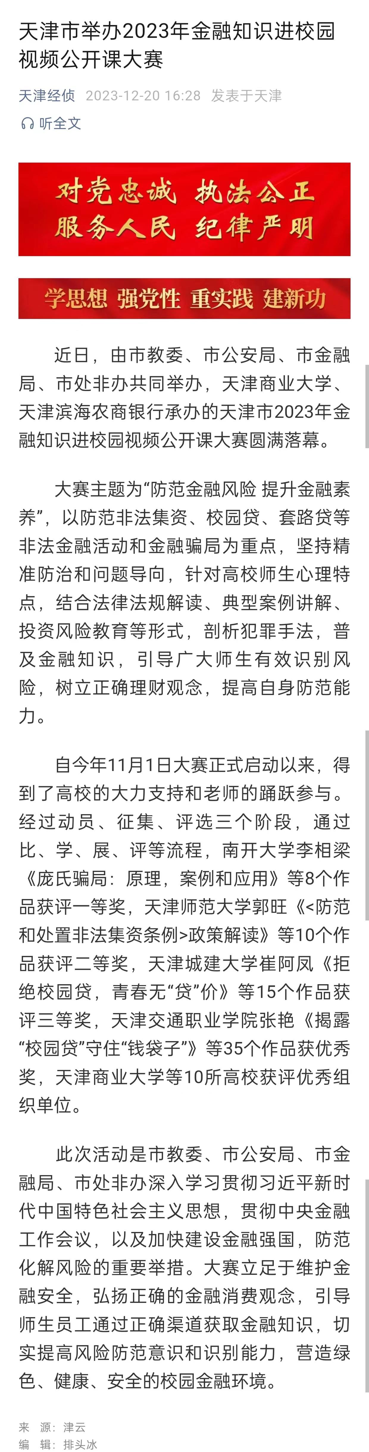 12月19日、20日,津云、北方网、津门教育微信公众号、天津经侦微信公众号报道学校承办2023年金融知识进校园视频公开课大赛。