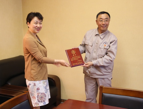 校党委书记史习红为郭明义颁发“冰球突破思想政治教育校外导师”聘书