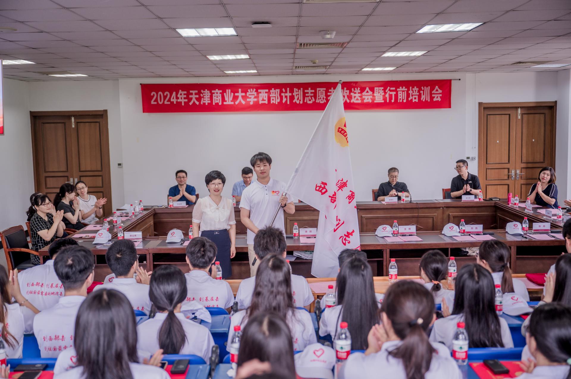王立云向西部计划志愿者授旗,对81名即将奔赴西部基层一线的志愿者们致以热烈祝贺与诚挚祝愿,对同学们到西部去建功立业、贡献青春力量表示高度赞赏,充分肯定了同学们志存高远、勇于奉献,用实际行动让报国之志成为报国之行的崇高理想与追求。