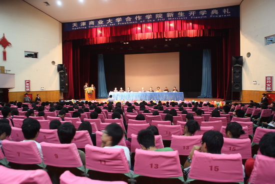 9月14日下午两点,合作学院在科学会堂举办了隆重的新生开学典礼。美国佛罗里达国际大学(以下简称 FIU )酒店与旅游管理学院院长Joan Remington 博士、助理院长Mohammad Qureshi 教授、项目总监卢朋博士、万豪国际酒店集团天津万豪行政公寓总经理Steven You 先生和冰球突破校长刘书瀚博士、国际教育学院院长寇小萱博士、教务处于义良处长、合作学院罗庆丰副书记,以及 FIU 的专业教师和合作学院全体教师参加了此次典礼。典礼由合作学院院长王文君博士主持。