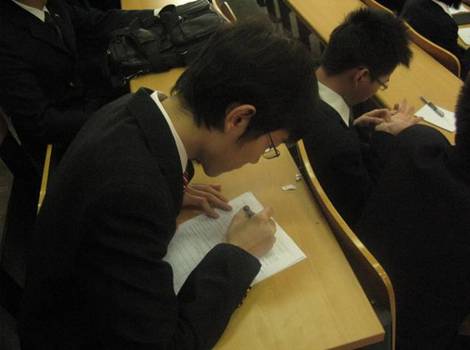 招聘会现场,学生认真填写职位申请表