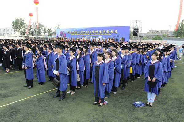 6月23日早6 点,冰球突破 2009 届学生毕业典礼在校足球场隆重举行。30 米宽的典礼台铺满崭新的红色地毯,180 平方米的蓝色背景墙上“冰球突破 2009 届学生毕业典礼”几个大字在朝阳中熠熠生辉,红色的氢气球、红色的拱门、红色的“一品红”鲜花、红色的条幅使典礼现场沉浸在喜庆的海洋中。校党委书记陈学奇、校长刘书瀚,校党委副书记杨万义、史习红,副校长魏胤亭、马三津,及校长助理、教务处长、研究生部主任、各专业学院院长等 23 位导师身着导师服出席典礼, 300 余名家长前来观礼,共同见证 2009 届 2937 名学生顺利完成学业,即将翻开人生新的篇章这一美好而幸福的时刻。典礼由学工部部长贾青主持。